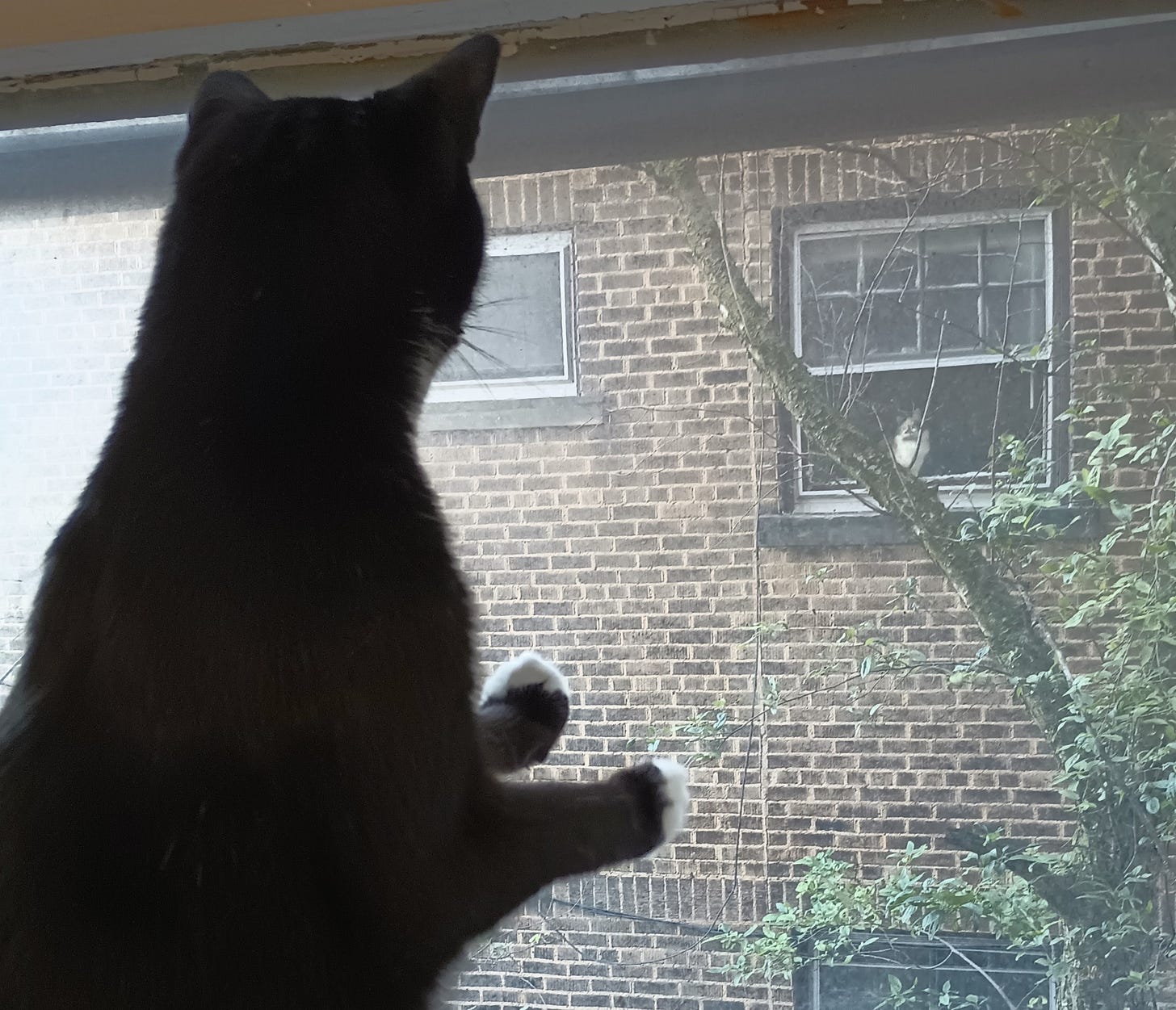 All of this back and forth but Ms. Calico has not been seen in three days. Everyday Harry jumps up into the window and looks for her. But she’s not there. I tell him to be patient, it looked like maybe her family was away for a few days. I told Harry she would return, she was just on vacation. It is hard to be patient when you’re in love.